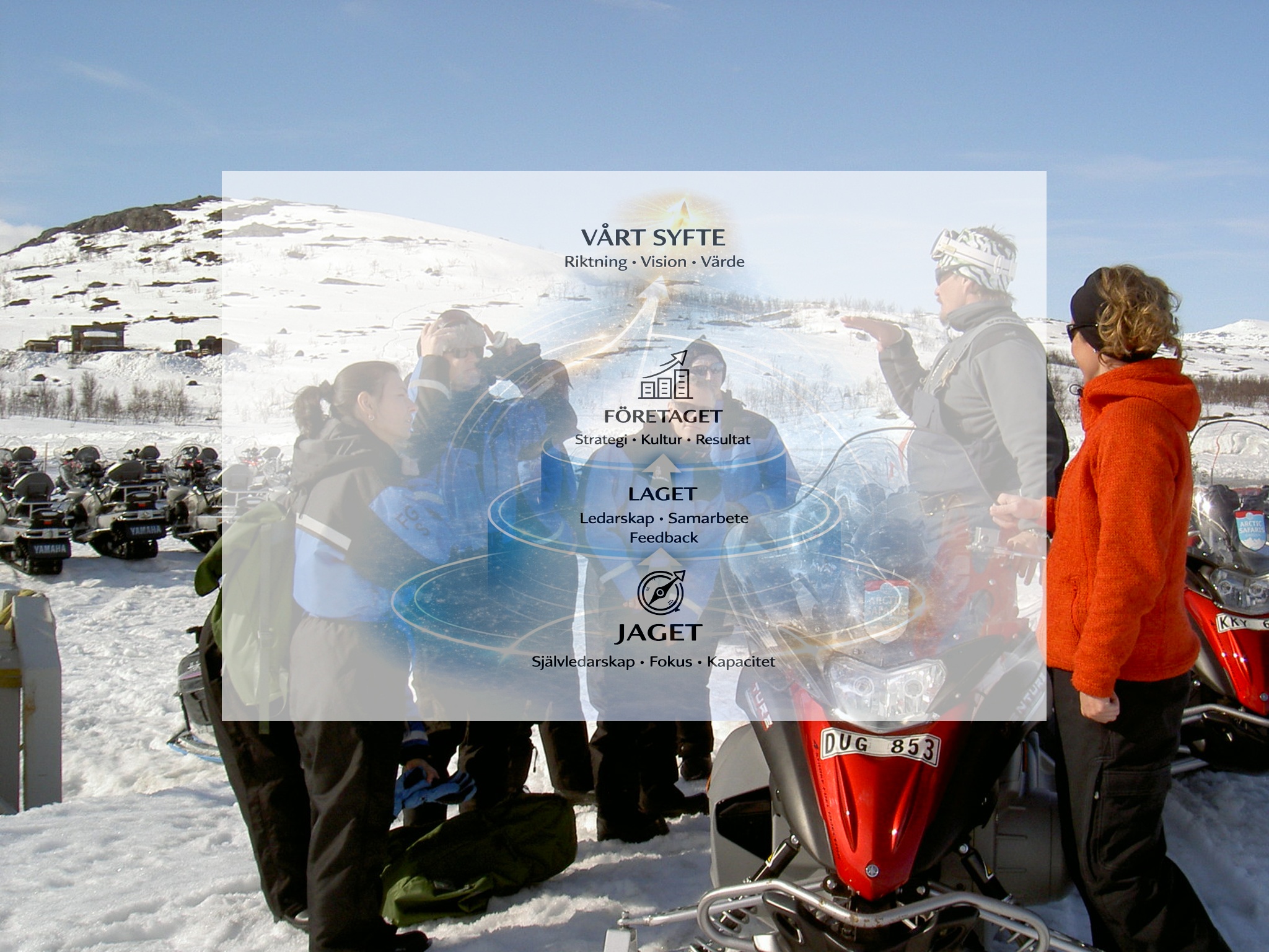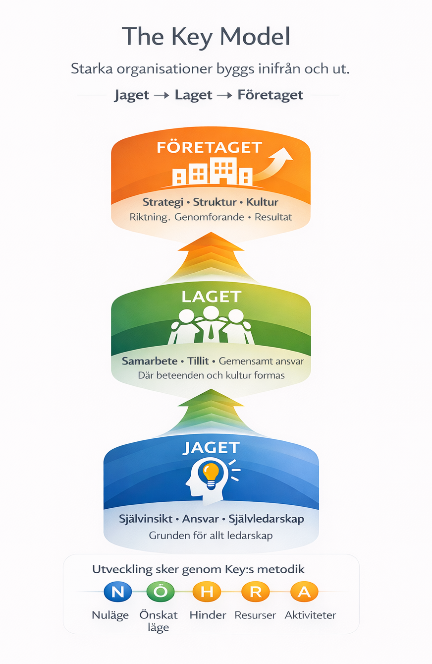 Vi arbetar metodiskt med Jaget, Laget och Företaget. Så skapas organisk utveckling. För individer bygger grupper, och grupper bygger företag.