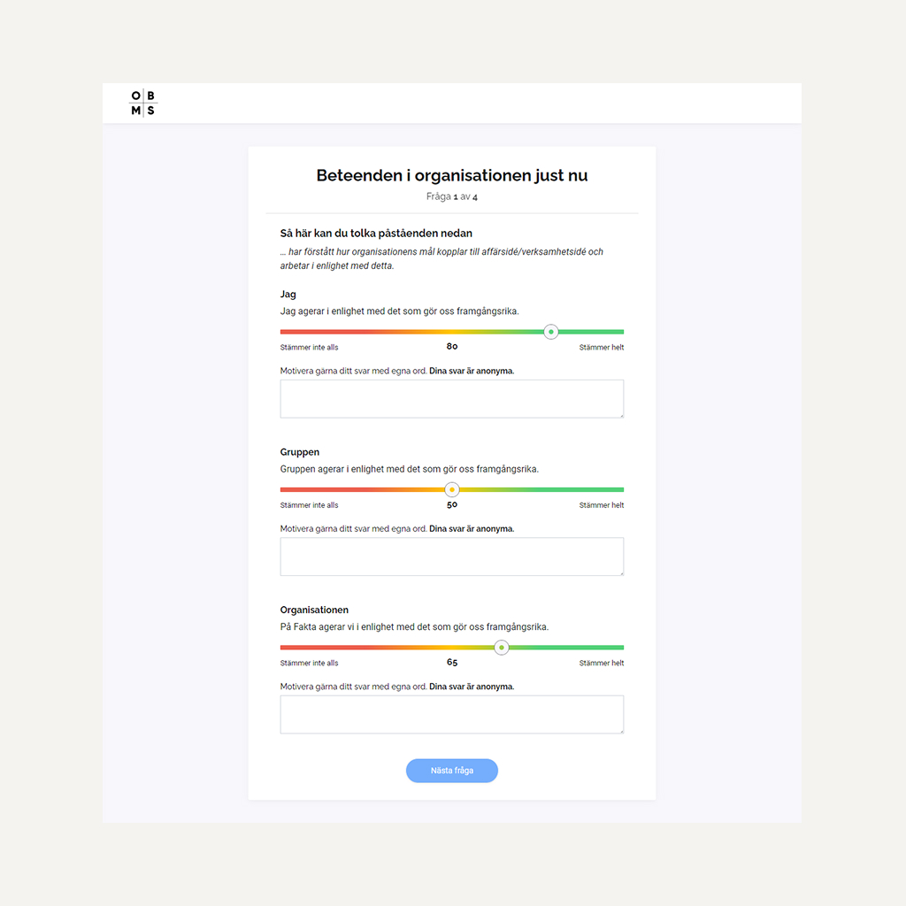 Key: OBMS innehåller en databas med mer än 160 påståenden som deltagare skattar i skräddarsydda enkäter. Dessa enkäter är enkla att sätta samman och skicka ut på bred front, och svaren skapar en detaljerad bild av organisationen nuvarande struktur, kultur och beteenden.