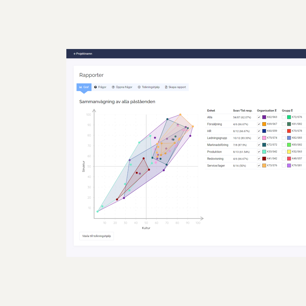 Key: OBMS genererar ett antal olika typer av rapporter, där den kanske viktigaste är ett diagram som visar spridning av beteenden på organisations-, grupp- och individnivå. Varje respondents sammanvägda svar representeras av en punkt som står i direkt relation till organisationens struktur och kultur. Detaljerade analyser av olika aspekter av enkäterna kan filtreras ned på gruppnivå. Fritextsvar, som många gånger ger en ännu mer verklighetstrogen bild, redovisas dessutom in en egen avdelning.